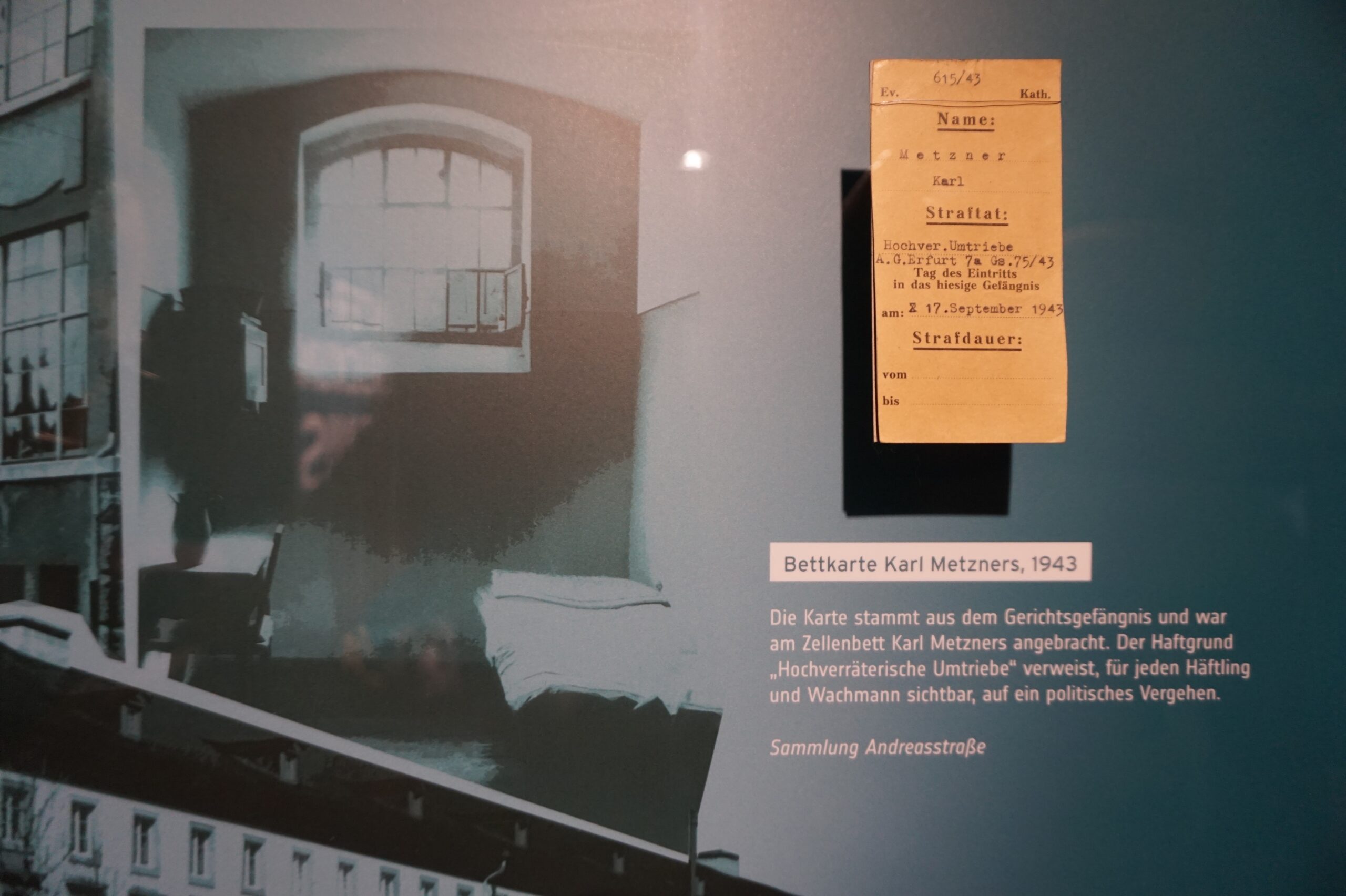 Die Ausstellung „Gefangen unter Hitler – Politische Häftlinge im Erfurter Gefängnis 1933–1945“ ist Teil der Dauerausstellung der Gedenk- und Bildungsstätte Andreasstraße. Sie beschäftigt sich mit der Nutzung des Gebäudes in der Zeit des Nationalsozialismus. Das Gefängnis dient als Ort politischer Verfolgung. Inhaftiert werden Menschen, die dem NS-Regime widersprechen oder nicht in dessen Weltbild passen. Biografien, Fotografien und historische Dokumente zeigen einzelne Haftschicksale. Zugleich machen sie die Strukturen nationalsozialistischer Repression sichtbar. Die Ausstellung ordnet das Erfurter Gefängnis in seinen lokalen und historischen Zusammenhang ein. Sie verdeutlicht das Zusammenspiel von staatlicher Gewalt und Justiz im NS-System.