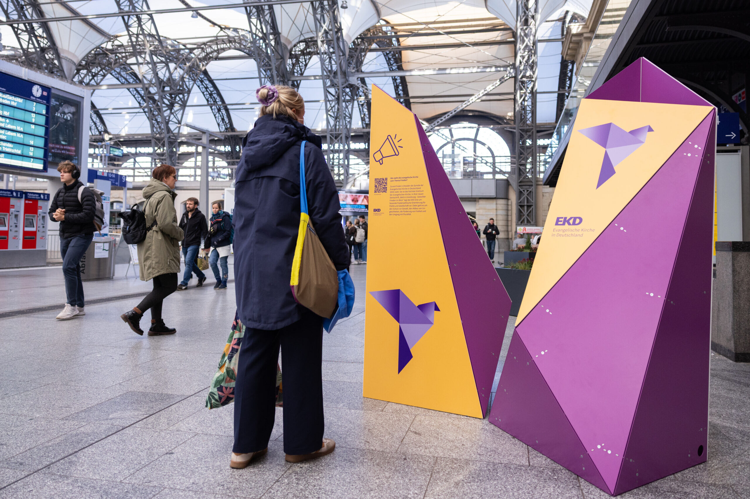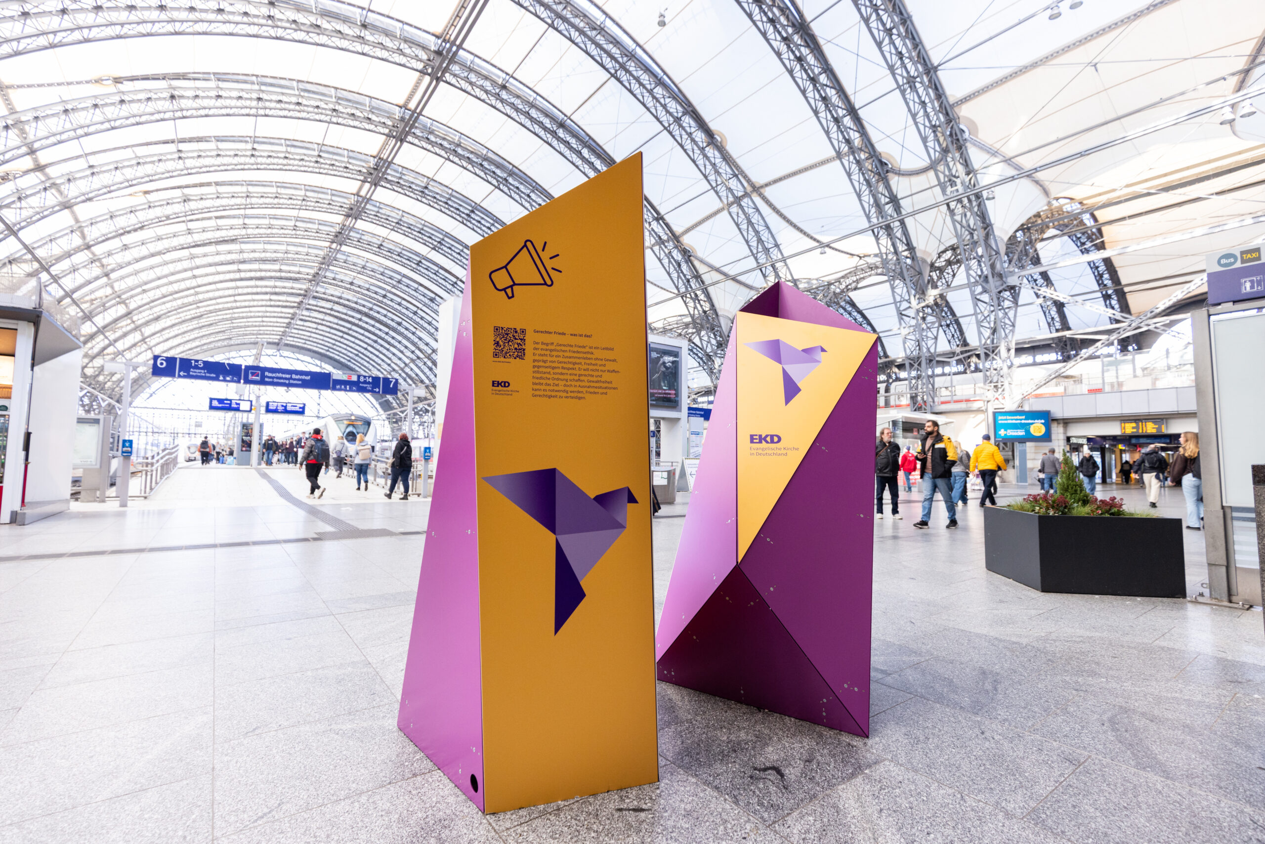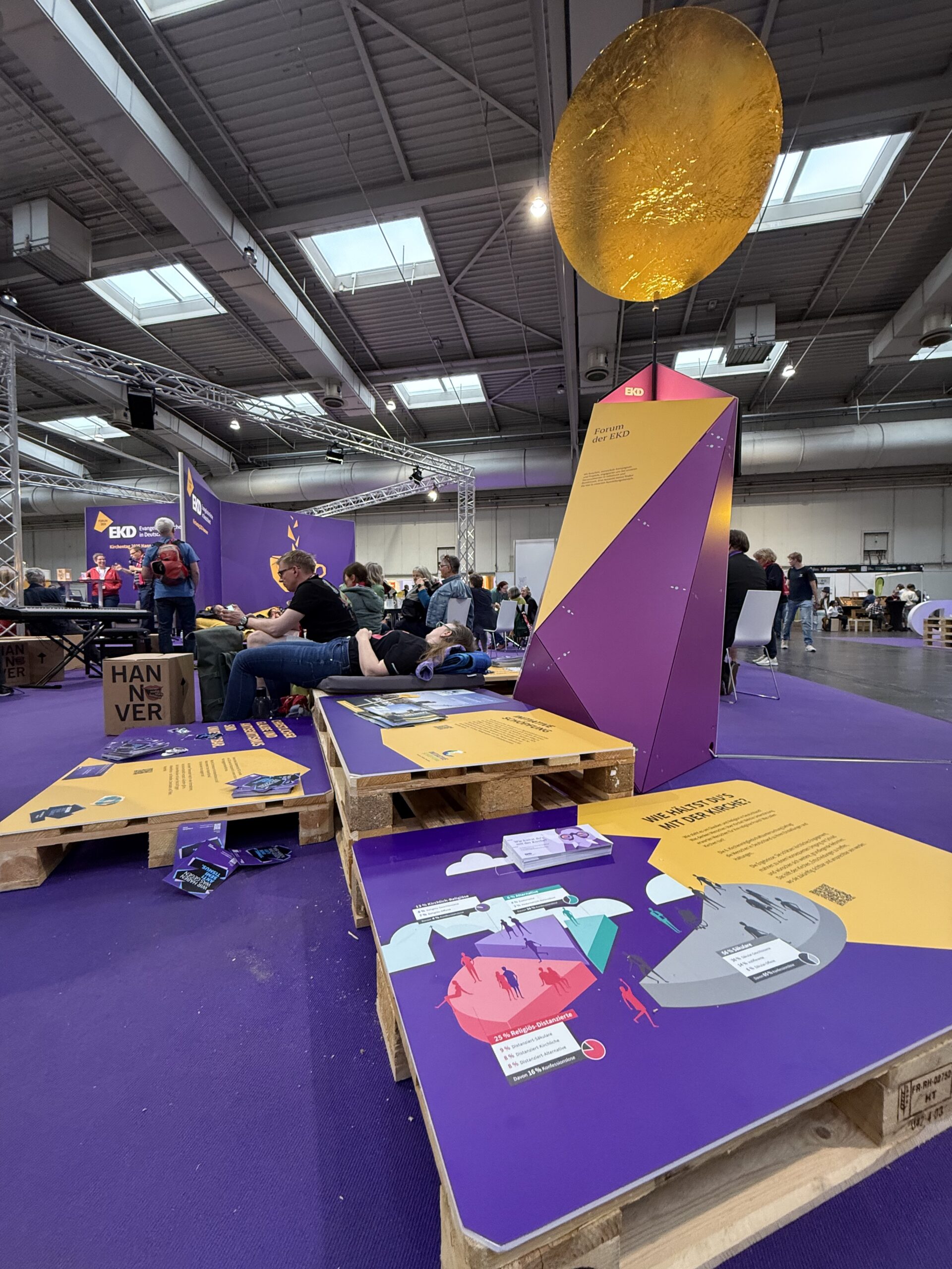 Der Gemeinschaftsstand der Evangelischen Kirche in Deutschland auf dem Deutschen Evangelischen Kirchentag 2025 präsentiert sich als großzügig gestalteter Treffpunkt auf dem Markt der Möglichkeiten. Auf rund 600 Quadratmetern vereint er zahlreiche Arbeitsbereiche und Partner der EKD unter einem gemeinsamen Dach. Die offene Standarchitektur lädt zum Eintreten, Verweilen und Austauschen ein. Klare Raumstrukturen, unterschiedliche Zonen und eine helle, moderne Gestaltung schaffen Orientierung und Atmosphäre zugleich. Informationsflächen, interaktive Elemente, eine kleine Bühne sowie Ruhe- und Begegnungsbereiche greifen ineinander und ermöglichen vielfältige Nutzungen. Der Stand verbindet in seiner Gestaltung Transparenz, Zugänglichkeit und Kommunikation und wird so zu einem offenen, lebendigen Ort des Austauschs und der Begegnung auf dem Kirchentag.