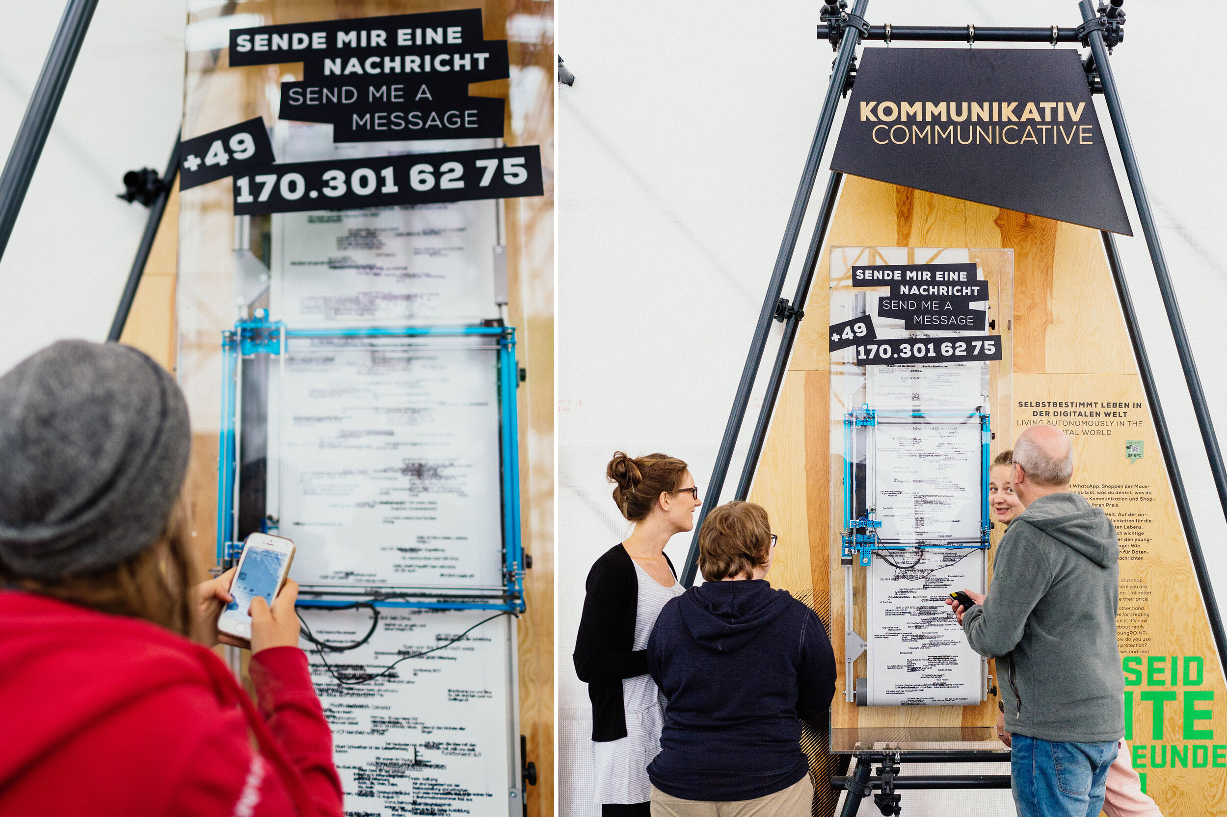 An interaktiven Stationen konnten die Besucher*innen eigene Thesen zum „Guten Leben für alle“ formulieren und plakatieren, ihren ökologischen Fußabdruck spielerisch ermitteln oder persönliche Botschaften über das Smartphone in ein endlos wachsendes, digital-analoges Kunstwerk einspeisen.
